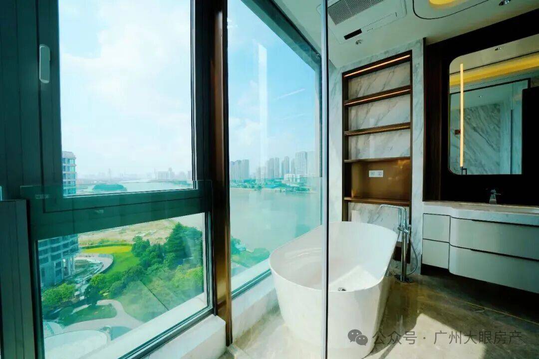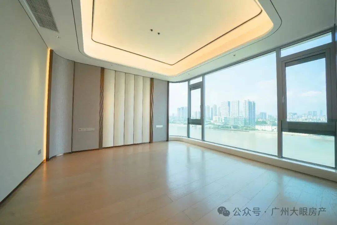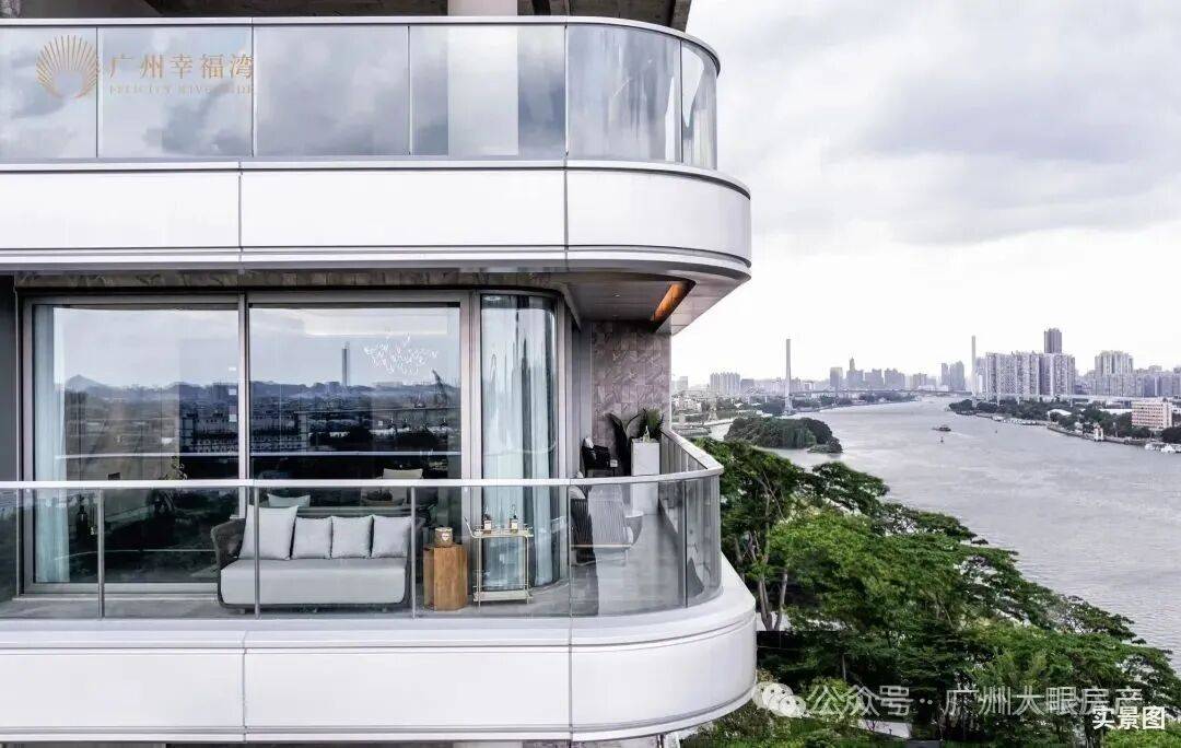 更震撼的体验,是当你步入阳台时。弧形玻璃的设计,让江景全画幅被你的视觉所占有,带来极强的视觉冲击力。驻足于此,你不需要去眺望江景,而是开阔的珠江直接将你环抱。