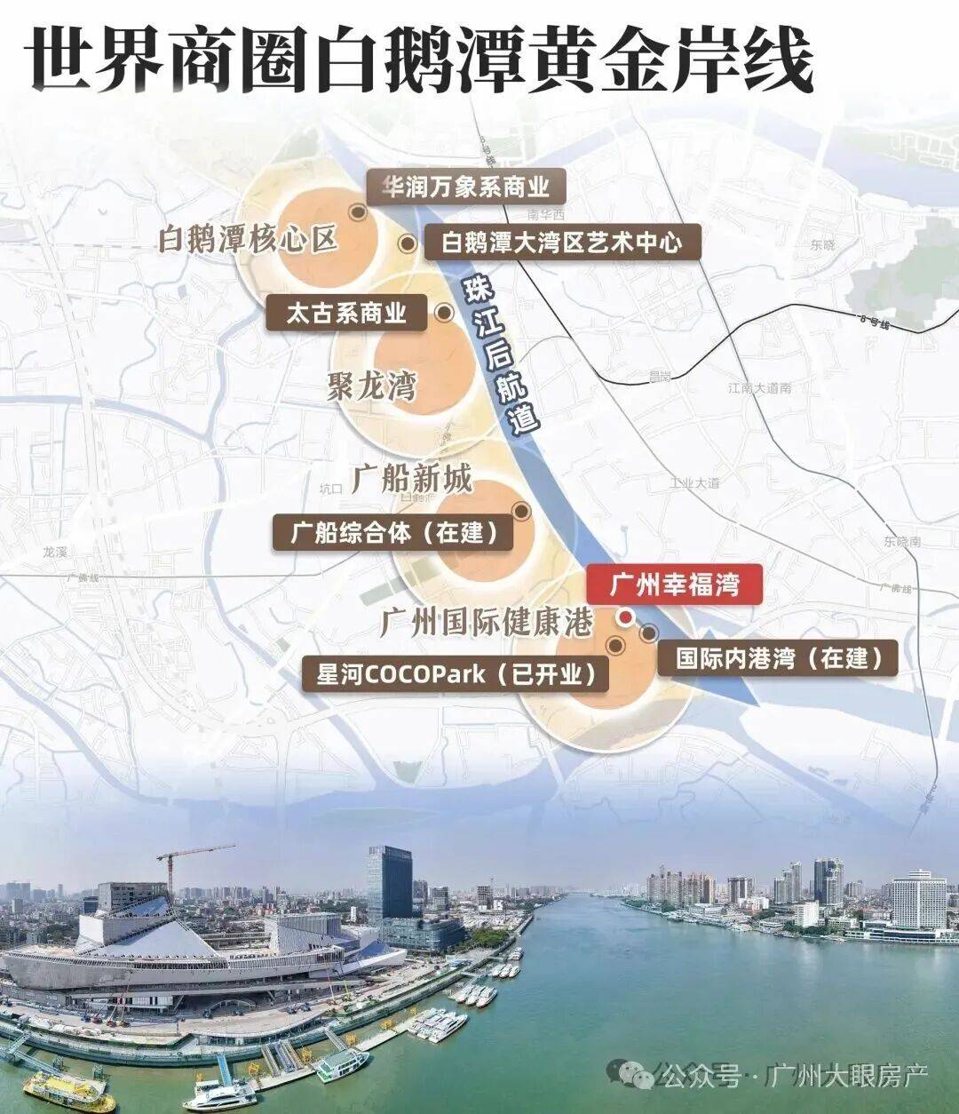 项目背靠千亿级大健康产业平台——广州国际健康港,体量约200万㎡,总投资超300亿元,共分四期开发,涵盖广州市区内唯一港湾游艇码头、产业综合体、购物中心、展览中心、写字楼和五星级港湾酒店等高端配套。