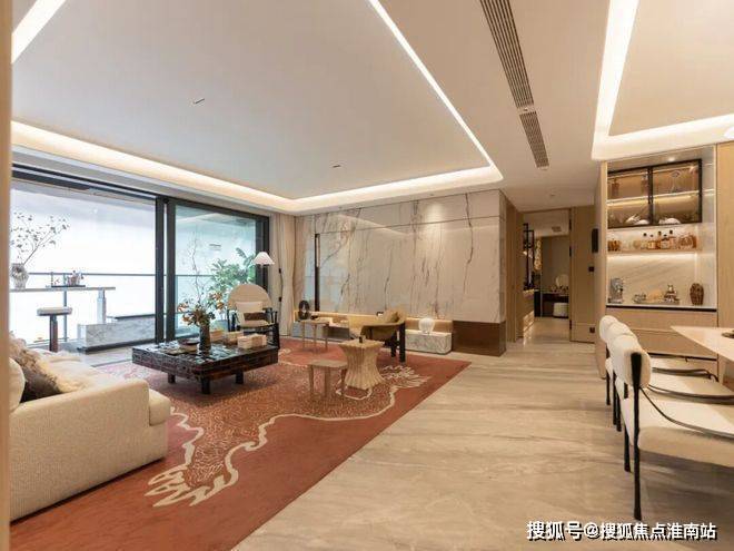 背景墙,如定格的艺术画布,其天然纹理与金属屏风的细腻肌理悄然对话。大面贝金米黄石材辅以抽槽分缝,云石壁灯宛如悬璧,点亮一隅的奢华与静谧。✅安高申陇院售楼处电话:✅︎✅︎✅