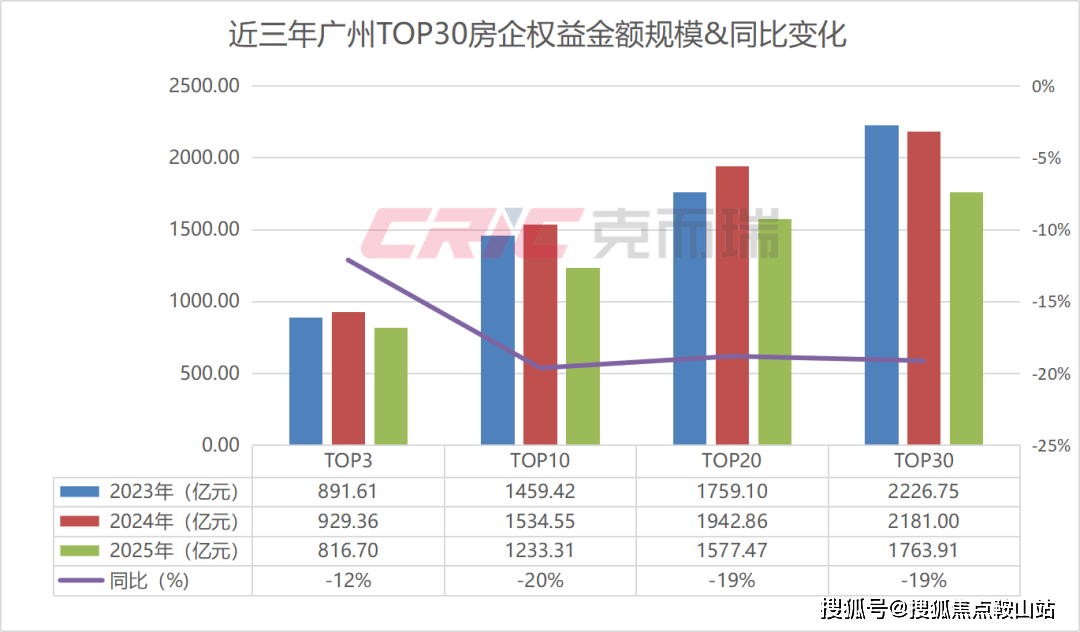 克而瑞数据监测显示,2025年广州权益金额TOP30房企业绩规模1763.91亿元,同比减少19%,TOP20梯队房企业绩规模1577.47亿元,同比减少19%;TOP10梯队房企业绩规模1233.31亿元,同比减少20%,TOP3梯队房企业绩规模816.7亿元,同比减少12%。