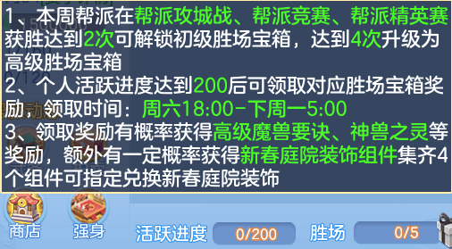 3)新增帮派胜场奖励,本帮当周在帮派攻城战、帮派竞赛、帮派精英赛活动达到一定的胜场后,帮派成员可领取对应档次的礼盒,礼盒有概率获得新春庭院装饰组件;
