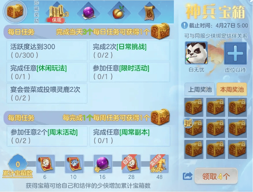 !完成每日及每周任务可获得宝箱储备,有机会获得神兽之灵、通灵符等高价值奖励。只需积攒到第四个宝箱,就能保底拿到一本高级兽诀!