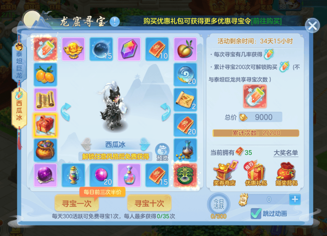 活动将开启西瓜冰武器皮肤和巨龙坐骑两个寻宝奖池,每日活跃获取免费寻宝机会,参与寻宝概率获得珍稀养成道具、巨龙之心。