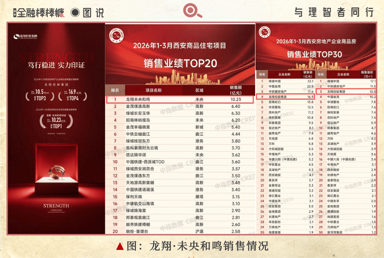 其寄予厚望的龙翔·未央和鸣项目,在今年前三个月销售额达到10.23亿,于西安所有在售项目排名第一,从而带动整体销售额达到16.9亿,排名增至第4位,成为第一季度西安房地产市场的黑马。
