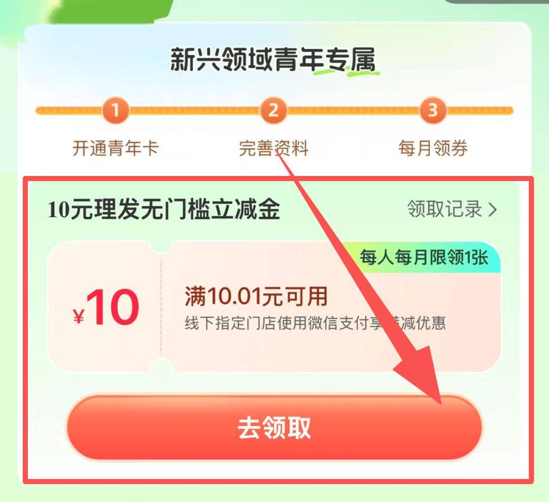 3. 领取补贴:注册青年卡,选择自己对应的从业类别,提交后即可成功领取10元补贴券,券会自动同步至绑定的微信卡包。