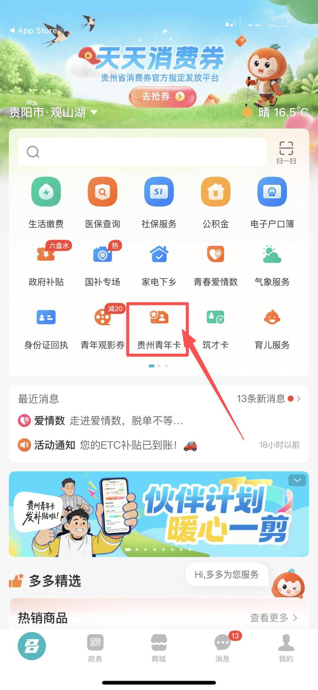 2. 进入首页:在首页位置找到【贵州青年卡】,点击进入【暖心一剪】活动页面;