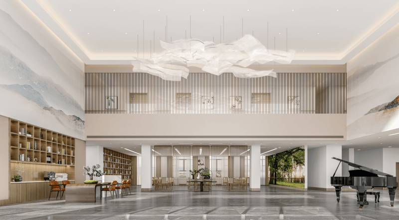 占地面积18000平米,建筑面积21000平方米,其中园林占地面积达7000平方米,绿意覆盖率高,亭台楼阁、花草树木相映成趣,营造出自然雅致的居住环境。主体建筑为“回”字形,体现天人合一的主题思想,采用古典与现代相结合的设计风格,既具文化底蕴,又不失现代便捷,向长者传递“健康至上”的核心理念。房间均按照老年人住宅标准建设,以人为本,崇尚自然、环境养生、关爱健康,每一处细节都贴合长者生活习惯,打造赏心悦目、宜居舒适的生存空间。