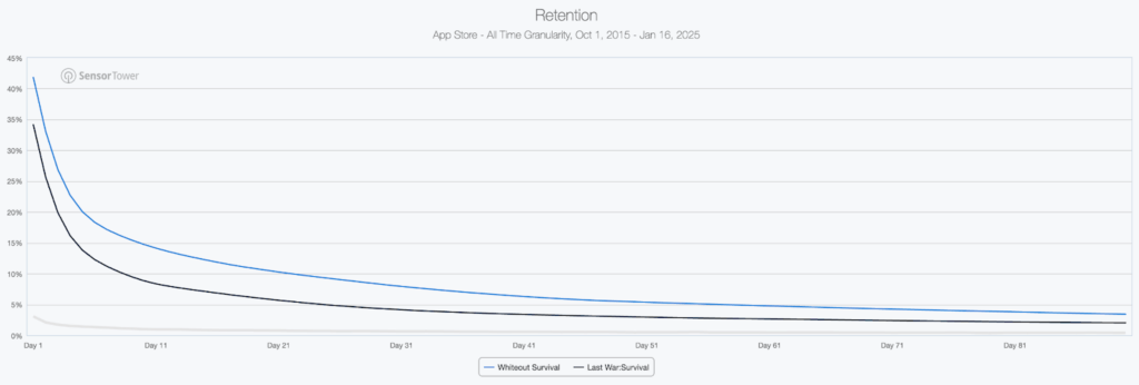 而《无尽冬日》的留存率却高得吓人,Day1 高达 42%,Day30 则是《Last War》的两倍 8%