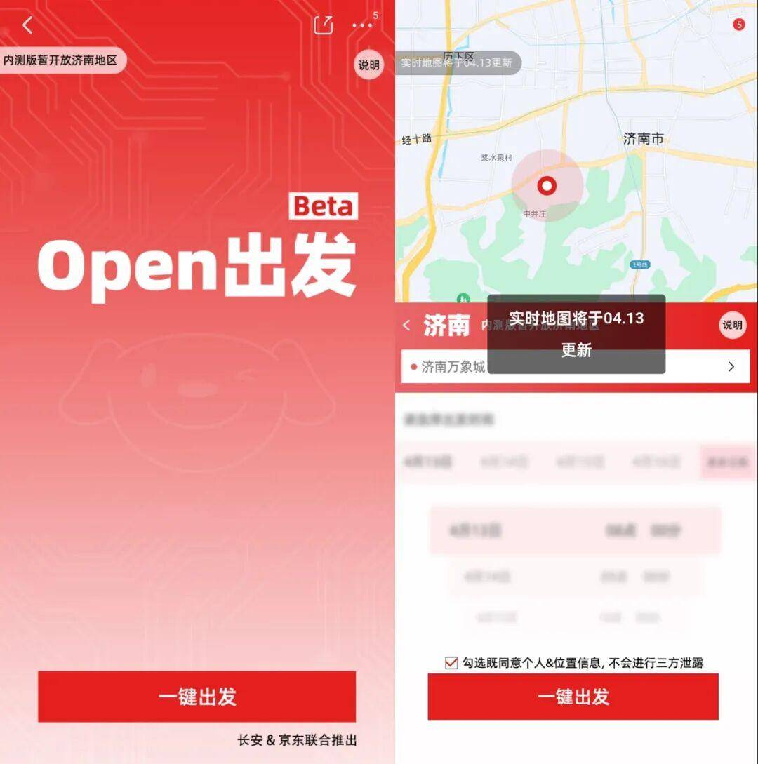2026年4月,京东App灰度测试Open出发服务,内测城市为济南,市场随即传言京东要做网约车。